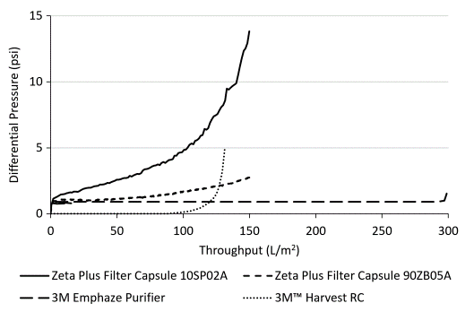最近,出现了一种新的解决方案,它采用纤维层析法高效且可放大地去除细胞、细胞碎片和关键的可溶性污染物。 3M Harvest RC Chromatographic Clarifier是一种单级层析澄清装置 (CCD),由 AEX 季铵 (Q) 配体功能化聚丙烯纤维床和 0.2 um 膜组成。在细胞培养澄清过程中,细胞和细胞碎片静电结合到 AEX 纤维上,从而有效保留大颗粒和小颗粒,而不会形成表面饼层。与离心或传统深层过滤相比,带电纤维介质还能够有效去除与可溶性工艺相关的杂质(即宿主细胞蛋白质和核酸),从而产生更清洁的流出物。 CCD 的推荐工作压差为 ≤5 psi,从而减少细胞剪切和裂解,进一步提高 HCCF 的质量并最大限度地减少二硫化物还原的可能性。此外,与传统的湿法深层过滤介质相比,CCD 的合成 AEX 介质在使用前需要更少的冲洗,从而节省了公用设施和时间。此外,水用作 CCD 冲洗液,因此无需缓冲液制备和相关缓冲液批记录的质量放行。